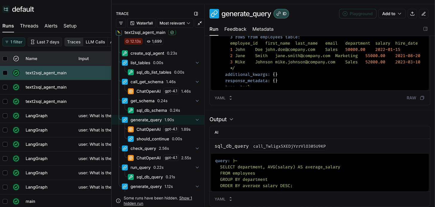 ...Any function wrapped in @traceable becomes a Run in LangSmith. Child runs (LLM calls, tool invocations) are auto-captured, so the whole graph—list_tables → get_schema → generate_query …—shows up as an explorable trace.